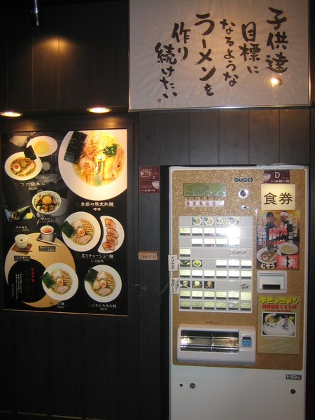 日本人很聰明, 每家店外都放一台食卷販賣機, 你可以投錢選擇你要吃什麼拉麵, 就會有一張票跑出來, 你再拿給店員就好, 完全不用講到話, 我覺得這樣真是方便極了, 省下waiter 站在桌子前等待客人思考點菜的時間